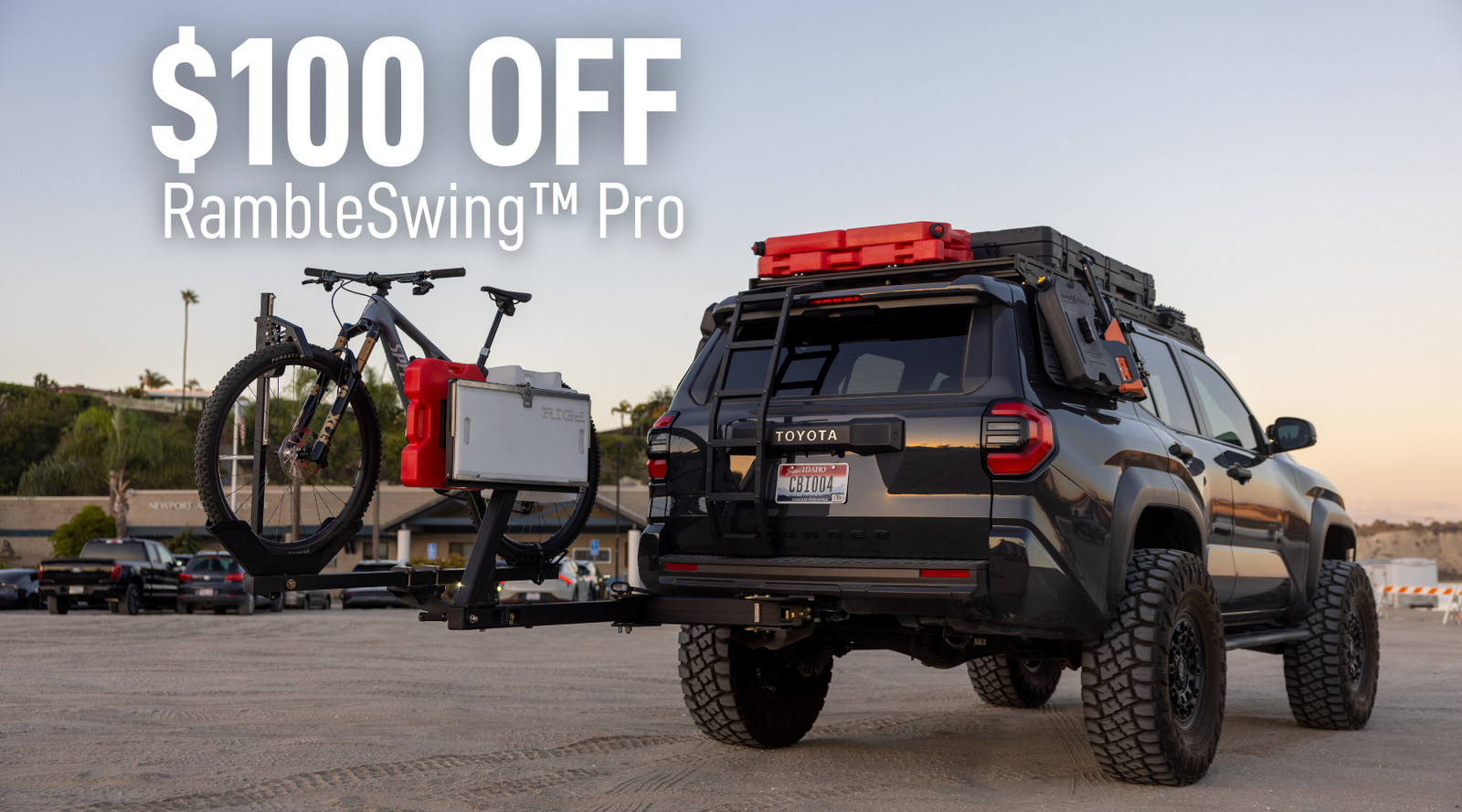 RambleRack™ is designed specifically for use on the UltraSwing, but will also work great on other off-road swing-out bumpers or as a static bike rack plugged straight into your hitch. RambleRack is our single-bike option with a static high-clearance stinger.