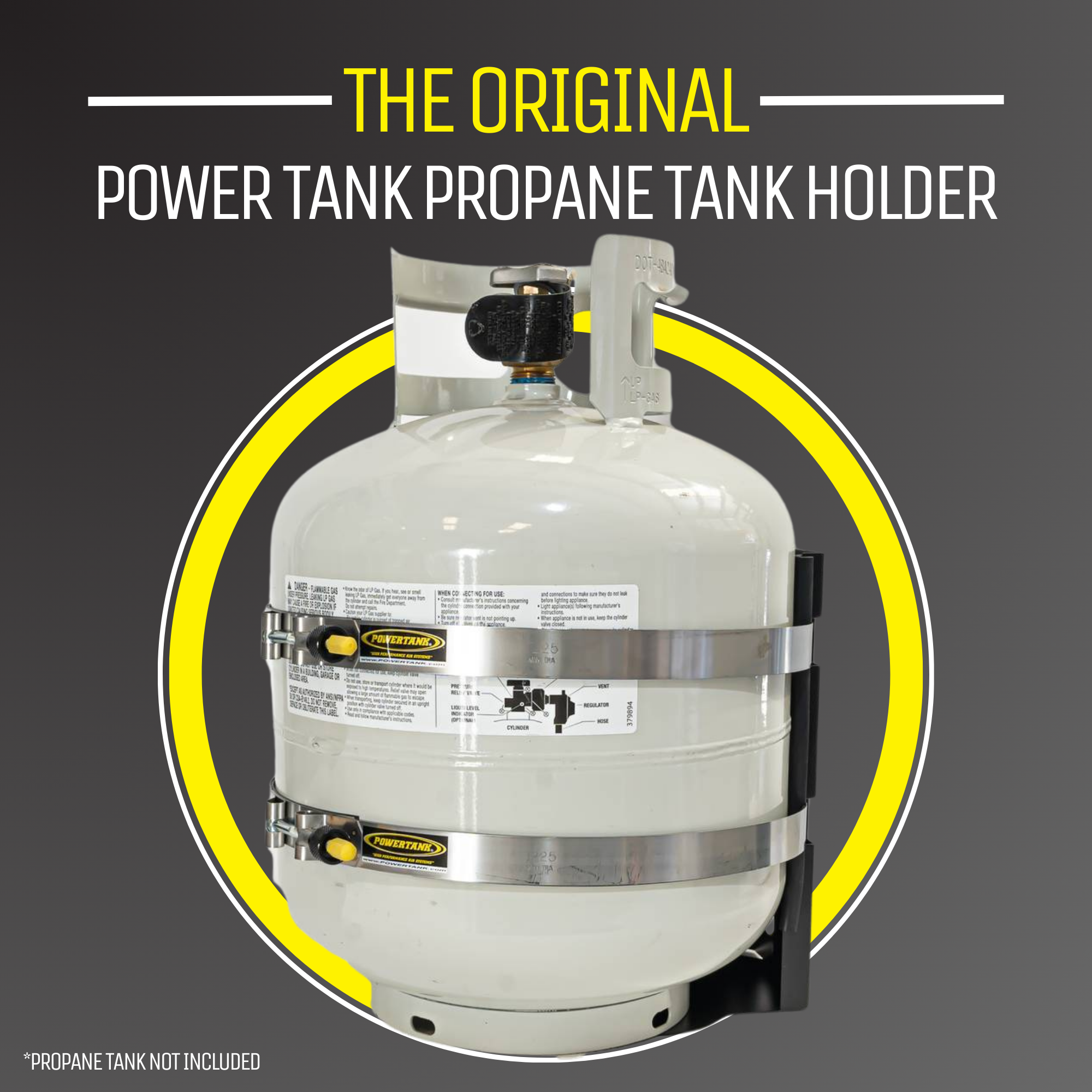Mounting Bracket for 20 lb. BBQ Propane Tank from Power Tank. This mounting bracket is the best way to carry 20 lb. Propane Cylinders on your RV, trailer, or boat. It features a marine-grade frame, strap, and rivets with rubber trim which will not corrode, even when exposed to salt water. The two straps hold the tank securely over rough, washboard roads or choppy sea water.